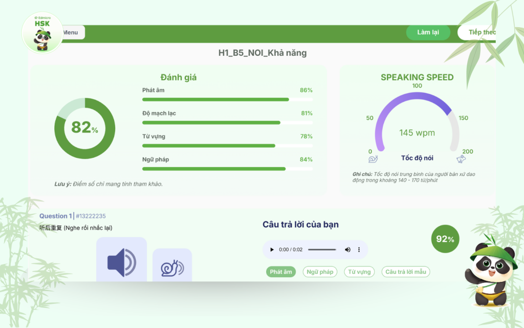 - Hệ thống AI chấm điểm tức thì: AI đánh giá từng âm, từng từ và so sánh với giọng chuẩn, chỉ rõ lỗi sai.