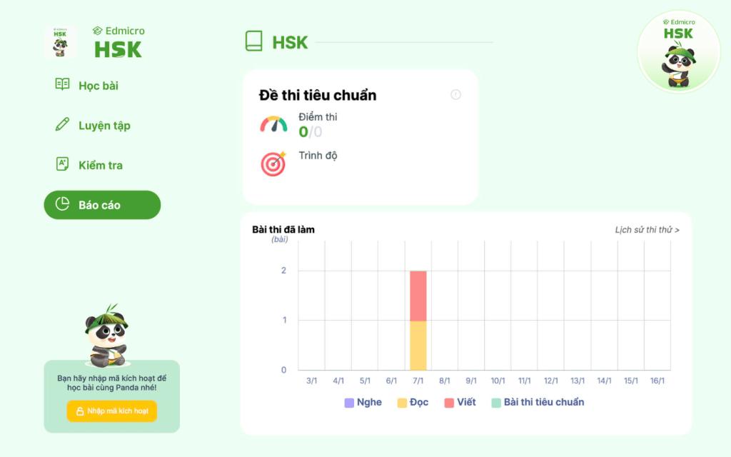 - Báo cáo tiến độ Edmicro HSK: Theo dõi toàn bộ bài tập đã làm, số điểm đạt được.