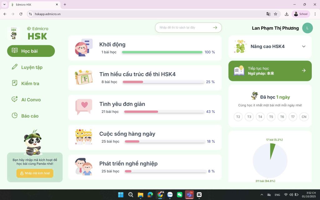 Lộ trình cá nhân hóa: Mỗi học viên là một cá thể riêng biệt với năng lực và mục tiêu khác nhau. Hệ thống AI của Edmicro HSK sẽ phân tích và xây dựng lộ trình học tập cá nhân hóa, đảm bảo bạn luôn học đúng trình độ, đúng trọng tâm và đạt mục tiêu nhanh nhất.